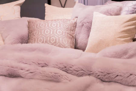 Pastep purple bedding - soft pillows and fur coverlet. coziness, comfort, interior and holidays concept