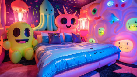Transport yourself back to the early 2000s in this uniquely decorated room boasting inflatable décor inspired by popular trends from the time such as inflatable aliens and emojis