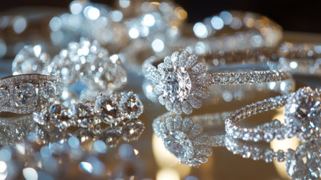 A glamorous display of various diamond jewelry pieces, including earrings, necklaces, and bracelets, elegantly arranged on a reflective surface, highlighting their shine.