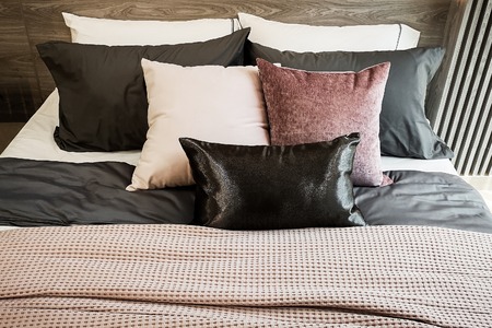 Beautiful pillow on the bed in the bedroom. Soft focus.