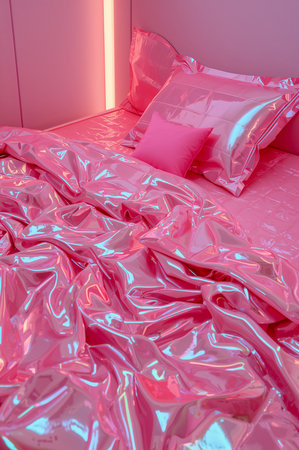 Bed with Satin Pillows and Sheets in pastel colors pink and lilac.