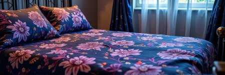 Cozy bedroom with floral bedspread in natural light. That the image is generated using AI.