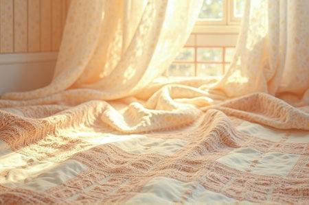Cozy sunlit bedroom with soft quilt and flowing curtains. That the image is generated using AI.
