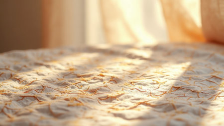 Sunlit fabric with intricate patterns illuminated by warm natural light. That the image is generated using AI.
