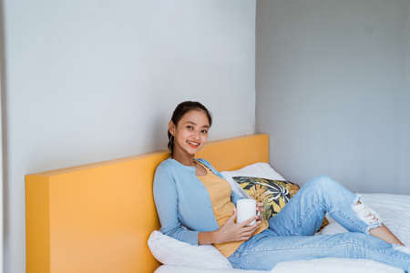 asian woman having coffee in cozy bedroom. Morning rituals.
