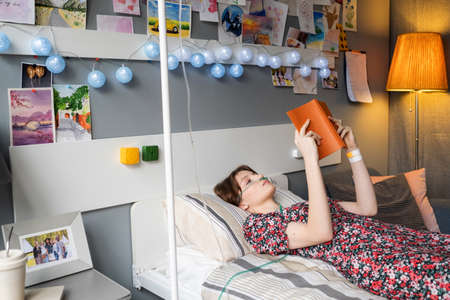Sick teenage girl lying on her bed and reading an interesting book during her treatment at hospital