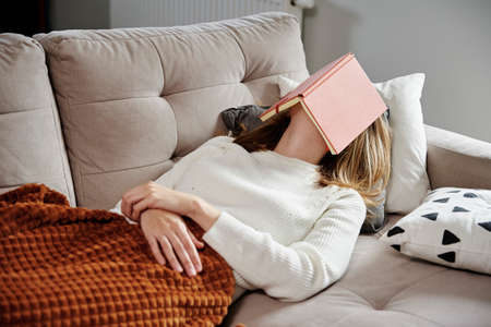 Tired woman sleeps on couch with book covered her face. Leisure day concept. Caucasian woman relaxing on sofa