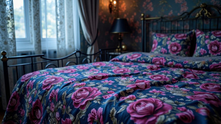 Vintage bedroom with floral bedding and elegant decor. That the image is generated using AI.