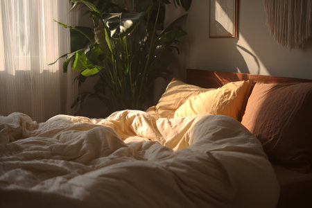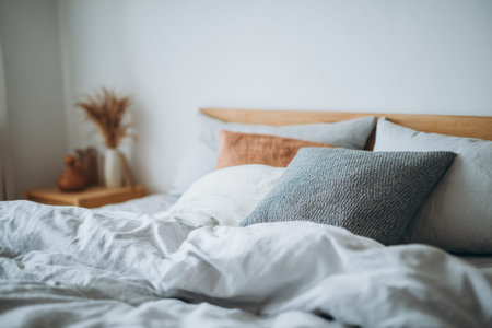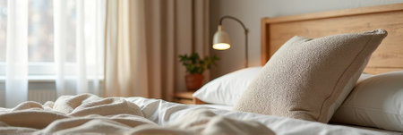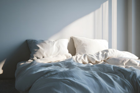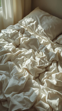 Soft bedding with rumpled sheets and pillows on a cozy bed in a serene morning light