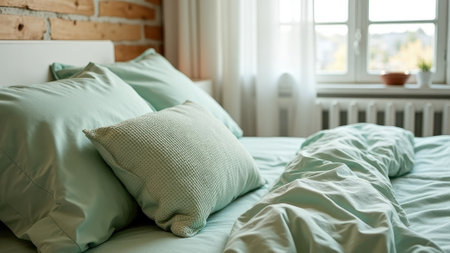 Cozy mint green bedding in sunlit bedroom with brick wall and radiator. That the image is generated using AI.