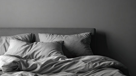 A serene gray bed setup featuring soft pillows and wrinkled bedding. This minimalist scene creates a relaxed atmosphere perfect for restful sleep and comfort.