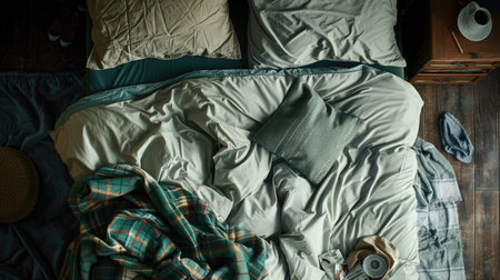 Top view of a messy bed with unmade pillow and blanket scattered. Ideal for depicting casual, lived-in spaces.