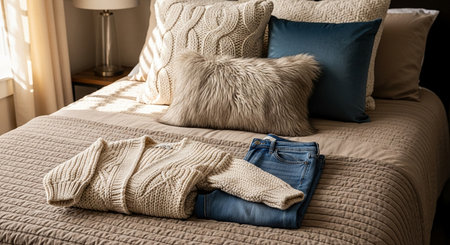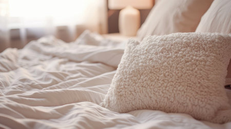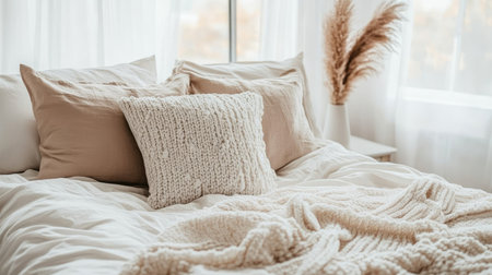 A cozy bedroom scene featuring soft textiles, plush cushions, and a serene atmosphere. Perfect for conveying comfort, relaxation, and modern interior design.