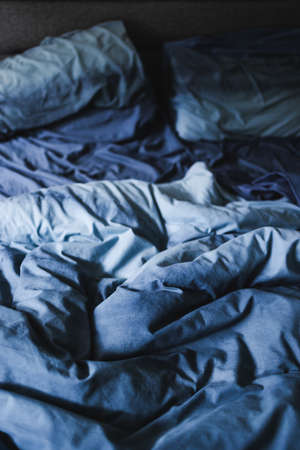 Dark blue color bedroom interior design. Unmade bed in the room. Minimalism, interior, comfort and bedding concept. Bed at home bedroom. Empty bed in morning time.