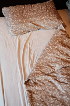morning bed ruffled after sleep wrinkled textile blanket and pillows beige