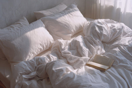 Cozy unmade bed with book in soft morning light. Generative AI