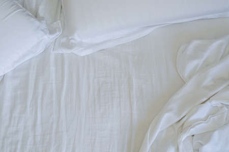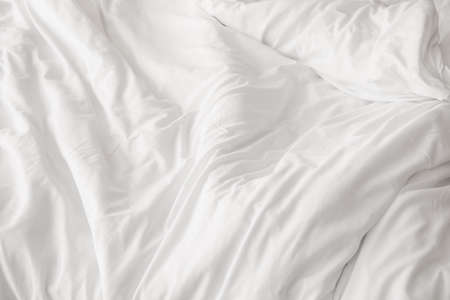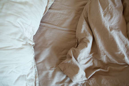 Top view of the crease of an unmade bed sheet in the bedroom after a long night sleep and waking up in the morning.