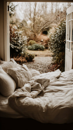 Soft bed linens invite relaxation as sunlight filters through open doors, revealing a serene garden filled with lush greenery and autumn hues.