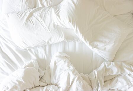 Messy bed, White pillow with blanket on bed unmade