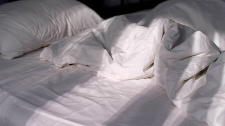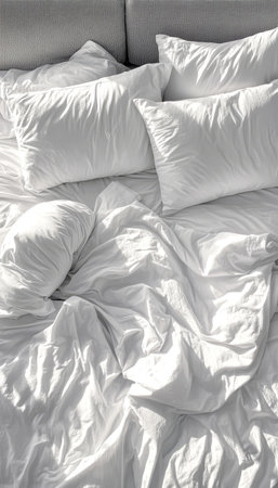 Cozy Unmade Bed with White Linens and Pillows in Morning Light for a Relaxing Bedroom Aesthetic