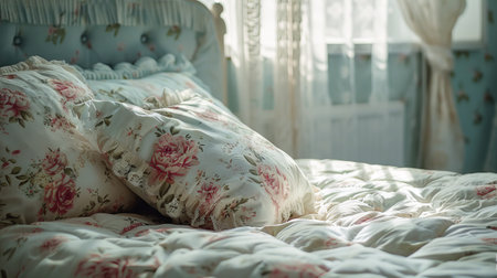Floral Bedding in Sunlit Vintage Bedroom with Sheer Curtains and Soft Cushions