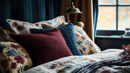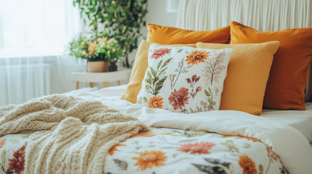 A cozy bedroom scene featuring floral patterns and warm accents. Soft cushions and a throw blanket create an inviting atmosphere perfect for relaxation.