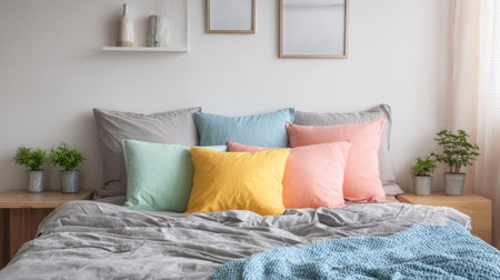 A well-lit bedroom showcases a bed adorned with an array of colorful pillows, with a soft blanket. The room features a neutral color palette, wooden elements, and potted plants adding to the serene atmosphere. The scene could be suitable for lifestyle publications, or interior design projects.