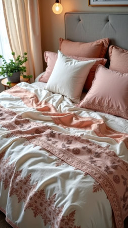 Elegant bedroom decor with soft pink and white bedding and greenery accents. That the image is generated using AI.