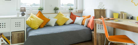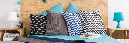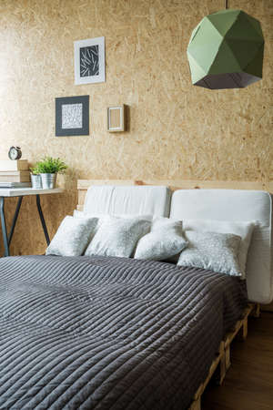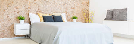 Spacious and bright bedroom interior with the marital bed with cushions, commode and wooden wall on a bedhead