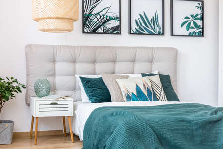 Rattan lamp above white cabinet with green vase next to bed with patterned cushions and green blanket in bedroom interior