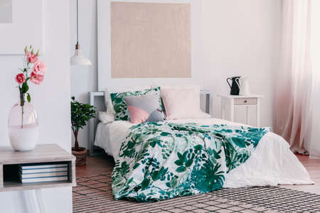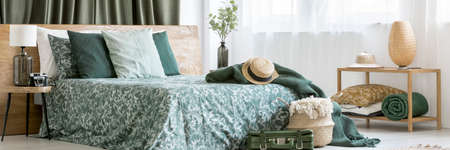 Floral design of bright bedroom interior with green blankets, straw hat and traveler's suitcase