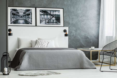 Posters on white bedhead of bed with grey bedding near lantern in bedroom interior with concrete wall