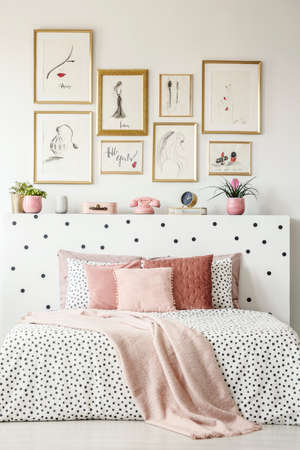 Front view of a king size bed with pink pillows, dotted sheets, headrest with decorations and paintings on the wall in a bedroom interior