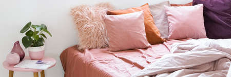 Real photo of a large bed with pink bedding and pillows standing next to a small table with a plant in bedroom interior