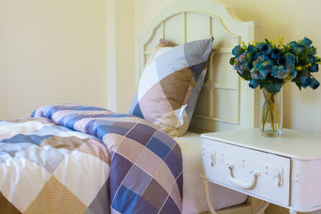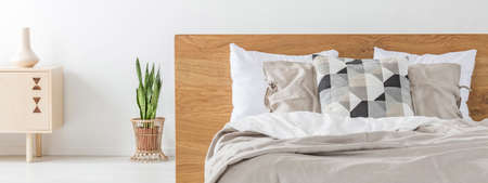 Close-up of a part of wooden bed with linen and pillows and a side cabinet with fresh cut flowers in a vase on top standing against a white wall in a bright bedroom interior. Panorama. Real photo.