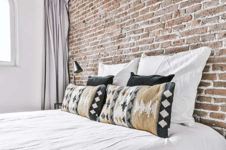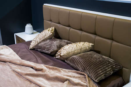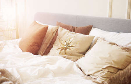 Closeup pillow on bed in warm bedroom modern interior. Home at sunny day