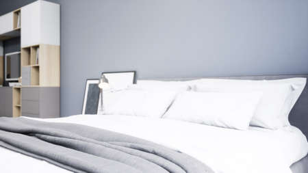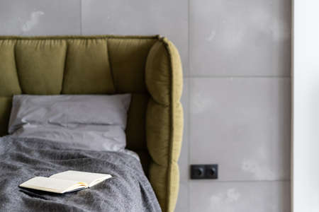 Cropped shot of minimalistic modern bedroom interior with comfy soft bed decorated with gray bedding, selective focus on open blank notepad or book on cover, blurred background