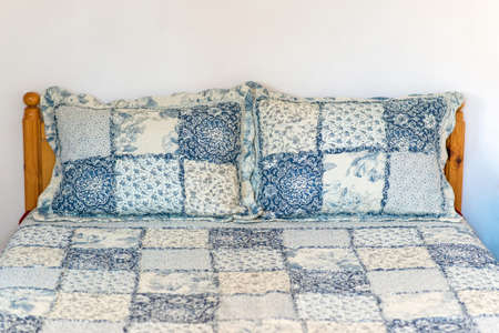Wide angle view of a traditional English bedroom in white with patchwork quilts