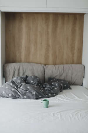 Cozy home interior decor, white wooden bed with a gray bedspread, decorative pillows, a cup of coffee and an open magazine