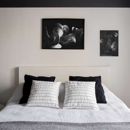 Grey and white pillows on bed with black headboard in simple bedroom interior. Real photo