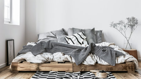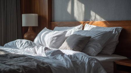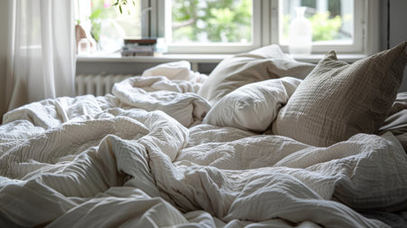 The bedding looks naturally messy and wrinkled to enhance the feeling of coziness and comfort. generative ai