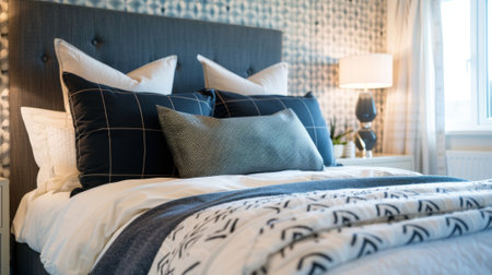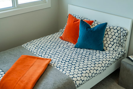 A cozy bedroom scene with vibrant geometric art, patterned pillows, a stylish lamp, and a touch of greenery creating a perfect relaxing ambiance. Generated A.I.