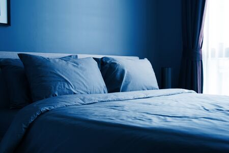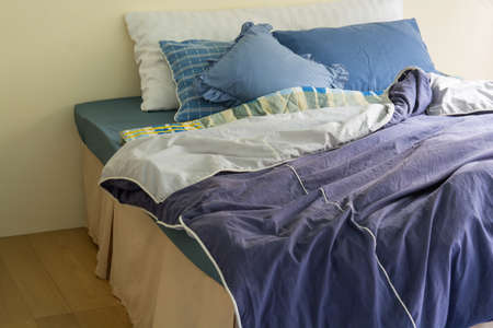 Dark blue color bedroom interior design. Unmade bed in the room. Minimalism, interior, comfort and bedding concept. Bed at home bedroom. Empty bed in morning time.