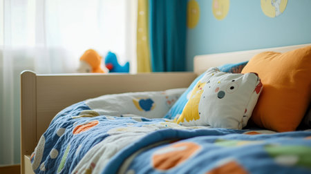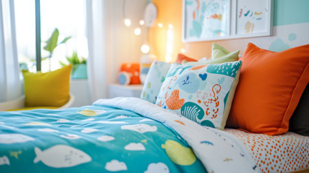A vibrant and cozy child's bedroom featuring colorful bedding and playful decor, creating a warm and inviting atmosphere for young children.