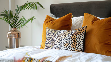 This image showcases a cozy bedroom interior featuring vibrant decorative cushions, a stylish modern plant, and elegant bedding, creating an inviting atmosphere.