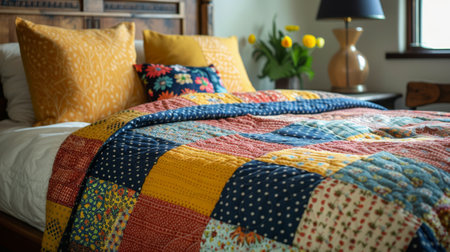 folk art quilting, colorful homemade quilt, adorned with vibrant patchwork, perfect for adding coziness to your summer folk art collection