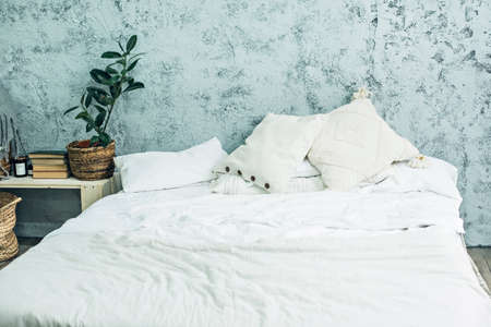 Light bedroom with white walls, big bed, pillows and houseplants. Copy space, place for text