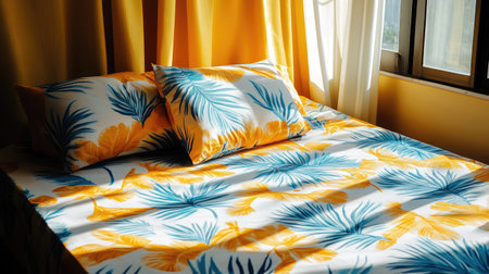 A vibrant bedroom featuring sunny floral bed linen and drapes, inviting warmth and comfort with soft sunlight casting playful shadows across the room.
