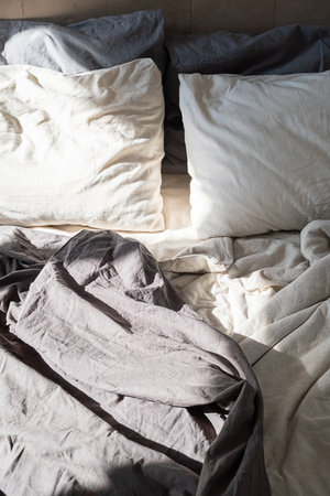 Unmade bed with crumpled linen sheets in morning light. Concept of slow living, cozy home interior or waking up.