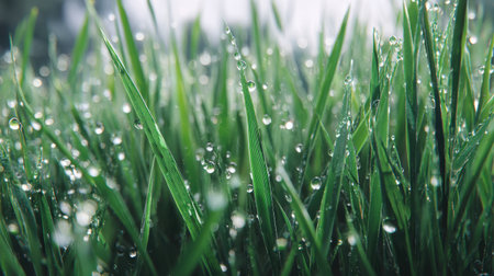 This close-up image features vibrant green grass blades adorned with glistening dew drops, beautifully capturing the essence and freshness of a serene morning in nature.